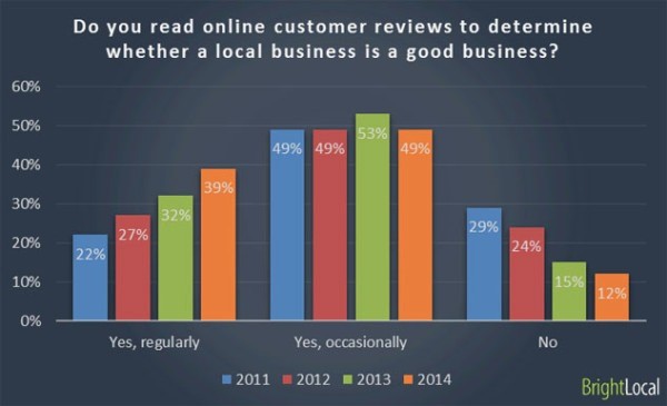 Acest grafic, reiesit din sondajul efectuat de catre BrightLocal asupra recenziilor clientilor lor locali, este este relevant pentru acest articol. 88% dintre potentialii consumatori citesc comentarii si recenzii pentru a determina calitatea unei afaceri locale.