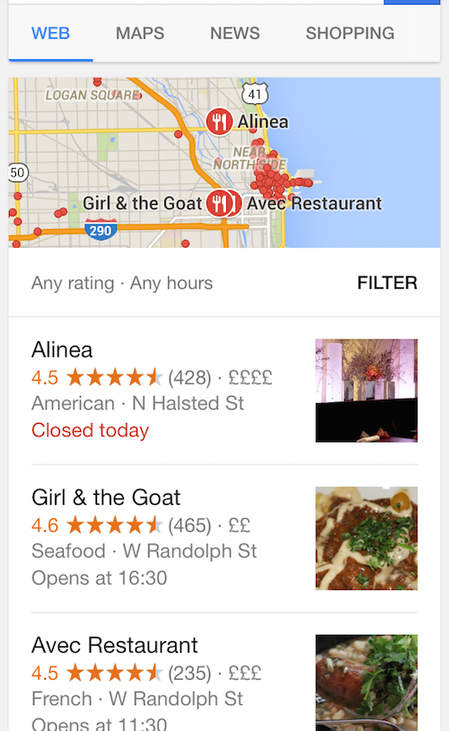 Sa aruncam o privire la aceasta cautare mobila a restaurantelor din Chicago. Cele mai bune pozitii in topul rezultatelor cautarii organice apartin restaurantelor care au primit recenzii pozitive: