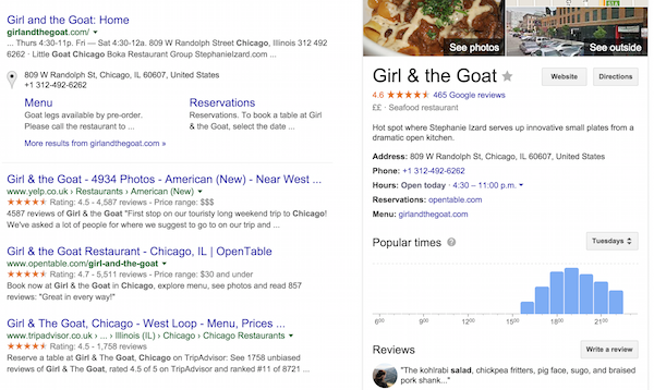 Pentru cautarile locale, daca vedeti un restaurant cu o medie de 4.6 din 465 de recenzii, precum „Girl & the Goat” din imaginea de mai sus, pare a fi o alegere sigura.